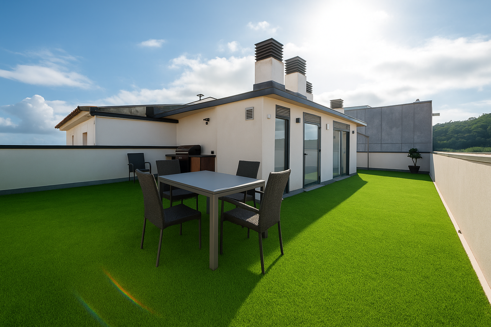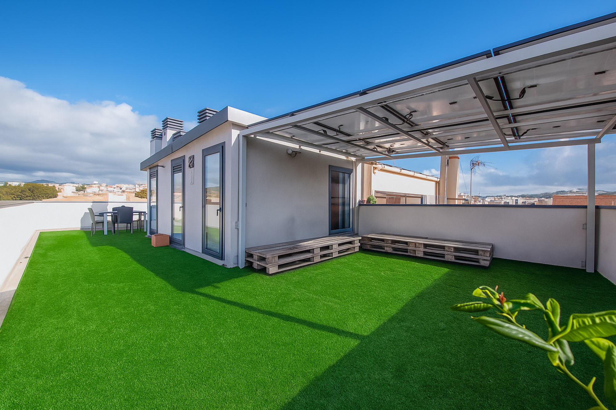 En la azotea, una espectacular terraza-solárium de más de 80 m² con zona de barbacoa, trasteros y espacios técnicos ofrece un entorno perfecto para relajarse y disfrutar del clima mediterráneo con total privacidad.