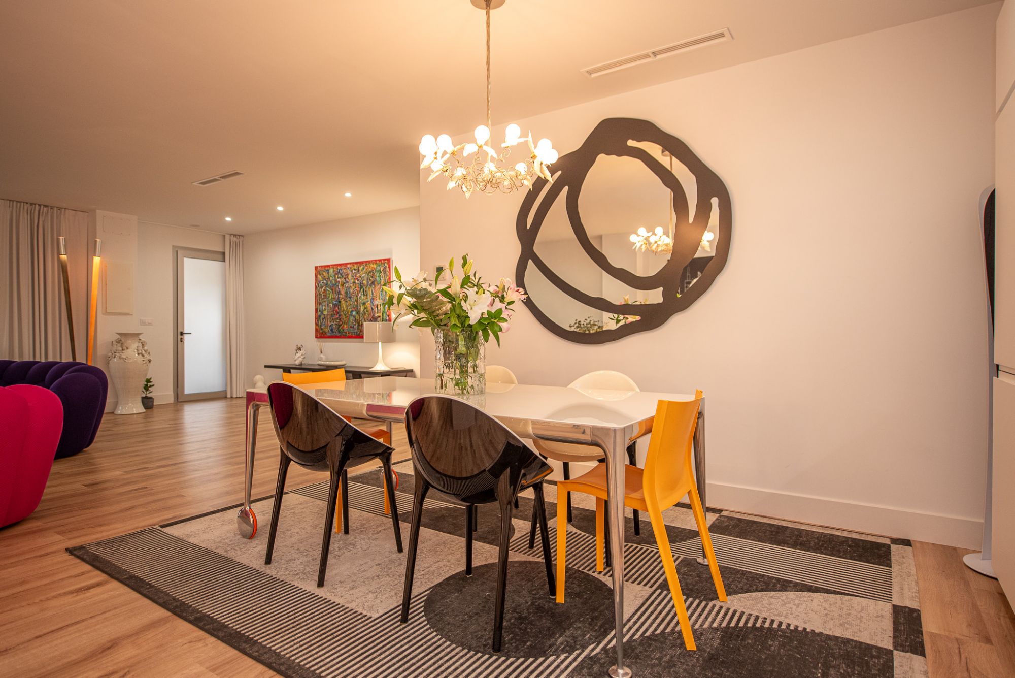 Inside, the finishes are modern and of high quality. It comprises a spacious area that combines a kitchen, dining room, and living room, with a large opening onto the terrace that maximizes natural light. The layout includes a suite, a double bedroom, and an interior room currently used as a painting studio, along with an adjacent laundry area and an additional full bathroom.